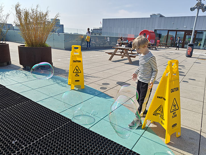 Vi startede med vandet på taget, hvor der var langt an til sæbebobler. Det blev han heldigvis ikke så våd af. Undervejs op, havde han spottet vandlegepladsen, og der gik ikke mange øjeblikke efter vi havde spist, før vi var på vej mod vandet.